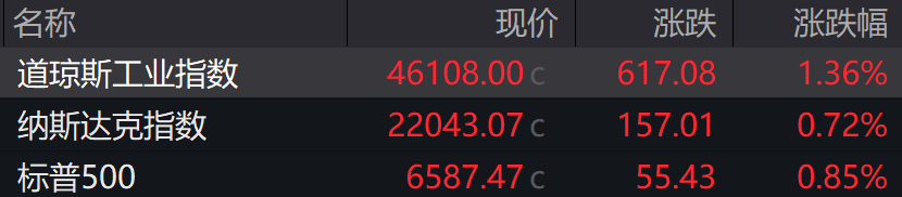 截至收盘 ,道琼斯工业平均指数上涨617.08点,涨幅1.36%,报46108.0点 ,历史上首次站上46000点关口;标准普尔500指数上涨55.43点,涨幅0.85%,收于6587.47点;纳斯达克综合指数上涨157.01点 ,涨幅0.72%,收于22043.07点,史上首次收在22000点上方。