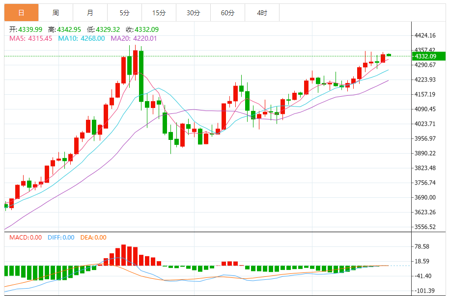 日线水平仍保持上涨趋势。金价自12月初突破4200美元关口以来,已形成“阶梯式”上涨趋势 。每次回调都没有跌破前期低点 ,交易量也同时增加,证实了上涨动能是有效的。目前金价稳守5日、10日、20日均线之上,均线多头布局。其中 ,5日均线4322美元盘中显着值支撑 。不过,日线层面MACD虽维持金叉,但KDJ指标有转向高位的迹象 ,认为短期需谨慎获利了结压力。