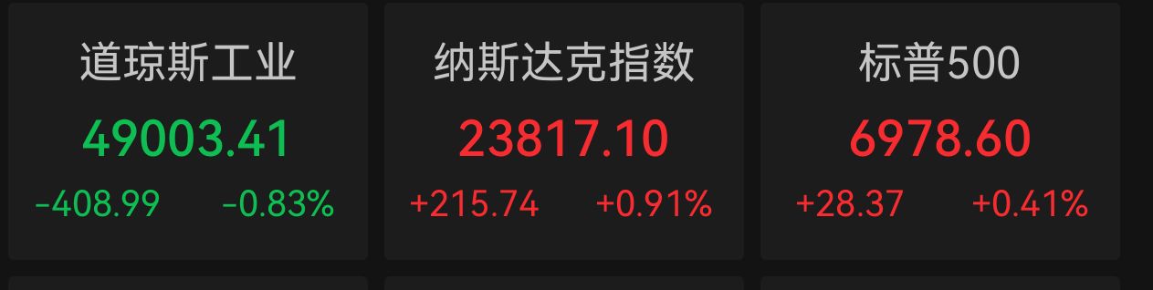 截至收盘 ,道琼斯指数下跌408.99点 ,跌幅0.83%,报49003.41点;标普500指数上涨28.37点,涨幅0.41% ,报6978.60点;纳斯达克综合指数上涨215.74点,涨幅0.91%,报23817.10点。