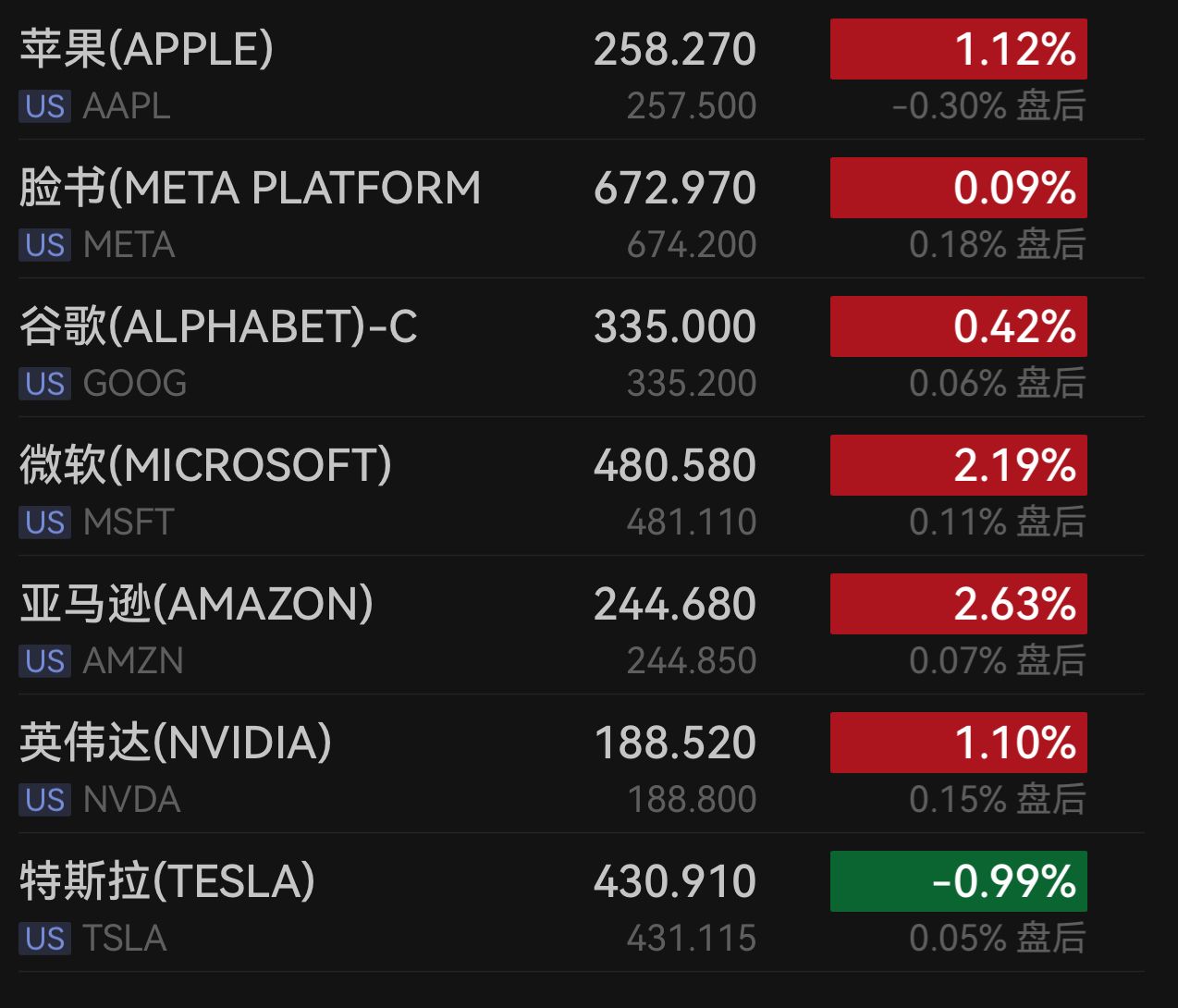科技板块继续领涨。英伟达涨1.10%,微软涨2.19% ,苹果涨1.12%,亚马逊涨2.63%,Meta涨0.09% ,博通涨2.44% ,谷歌涨0.42%,超威半导体涨0.29% 。特斯拉跌0.99% 。